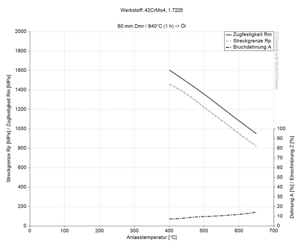 Die Streckgrenze von 1.7227+QT liegt bei ca. 655 N/mm2. Sie gibt an, wieviel Spannung aufgebracht werden kann, bevor sich ein Material plastisch verformt. Über diesen Punkt hinaus kehrt das Material nicht mehr in seine ursprüngliche Form zurück, wenn die Spannungen weggenommen werden, sondern bleibt verformt oder bricht sogar.